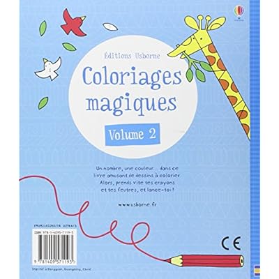 - Cette activité quelque peu tombée dans l’oubli a été réhabilitée par Usborne dans son premier Coloriages magiques. Ce second livre propose de nouveaux coloriages tout aussi intéressants à réaliser que les premiers. - En suivant le code, les enfants révéleront peu à peu des images parfois étonnantes. - Le compagnon idéal pour les longs trajets, les vacances et les jours de pluie.