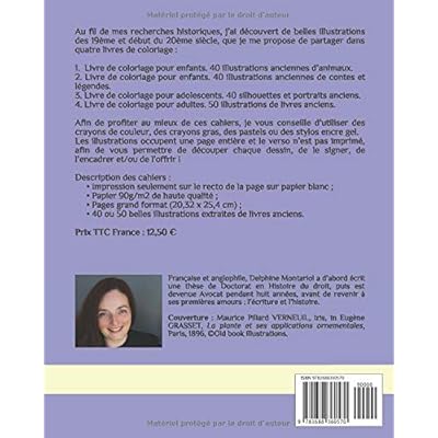 Au fil de mes recherches historiques, j’ai découvert de belles illustrations des 19ème et début du 20ème siècle, que je me propose de partager dans quatre livres de coloriage : 1. Livre de coloriage pour enfants. 40 illustrations anciennes d’animaux. 2. Livre de coloriage pour enfants. 40 illustrations anciennes de contes et légendes. 3. Livre de coloriage pour adolescents. 40 silhouettes et portraits anciens. 4. Livre de coloriage pour adultes. 50 illustrations de livres anciens. Afin de profiter au mieux de ces cahiers de coloriage, je vous conseille d’utiliser des crayons de couleur, des crayons gras, des pastels ou des feutres-gel. Les illustrations occupent une page entière et le verso n’est pas imprimé, afin de vous permettre de découper chaque dessin, de le signer, de l’encadrer et/ou de l’offrir ! Description des cahiers : • Impression seulement sur le recto de la page sur papier blanc ; • Papier 90g/m2 de haute qualité ; • Pages grand format (20,32 x 25,4 cm) ; • 40 ou 50 belles illustrations extraites de livres du 19ème siècle et du début du 20ème siècle (références complètes de chaque illustration à la fin du volume). A vos couleurs !