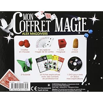 Abracadabra ! Le magicien, c'est toi ! Alex MagDivers, magicien confirmé, nous dévoile ses secrets et astuces pour réussir des tours à la manière des véritables professionnels ! Idéal pour s'amuser entre amis et même épater sa famille, ce coffret contient tous les outils et accessoires pour réaliser des tours abracadabrantesques ! A découvrir pour les apprentis magiciens : 25 fiches illustrées et faciles à manipuler lors de l'exécution des tours, un jeu de cartes spécial magie, 2 foulards, un faux pouce, trois balles en mousse, un carré magique en mousse et un DVD dans lequel Alexandre partage ses tours préférés et ses astuces de pro. Au programme, des tours avec des cartes, disparition des foulards, transformation des balles de mousse et bien d'autres surprises !